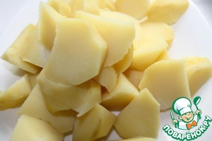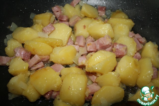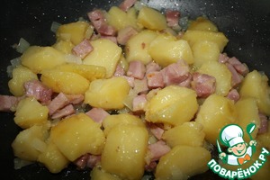 Разогреть масло и обжарить картофель с луком и мясом до золотистости.