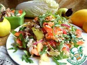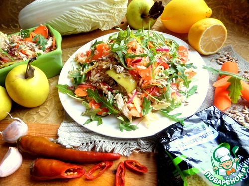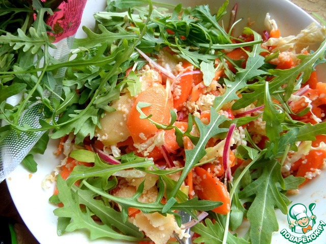 Салат для фанатов морковки и овощей-фруктов тоже. Кускус впитает соки и приятно дополнит состав салатика. Готовить рекомендуется перед самой подачей. Зелень заменяется на имеющуюся в доме.