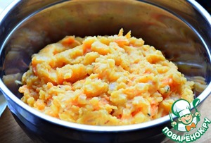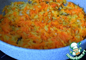 Морковь натереть на крупной терке, лук нарезать кубиком. Обжарить овощи в растительном масле до мягкости (2 ст. л.) -