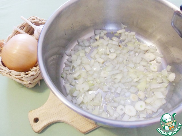 В кастрюле с толстым дном хорошо разогреть растительное масло. Жарить лук и чеснок около 5 минут до легкой золотистости и прозрачности.