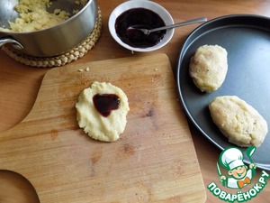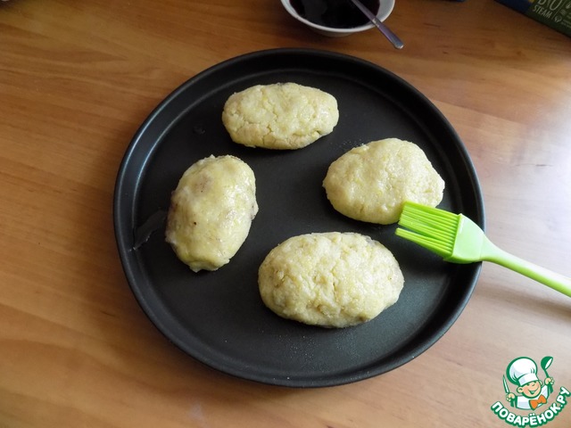 Формируем зразы из двух частей, между которыми выкладываем по 1 ч л черники. Этого делать не обязательно, можно просто сформировать котлеты, а чернику или другую протёртую ягоду положить в готовое блюдо.