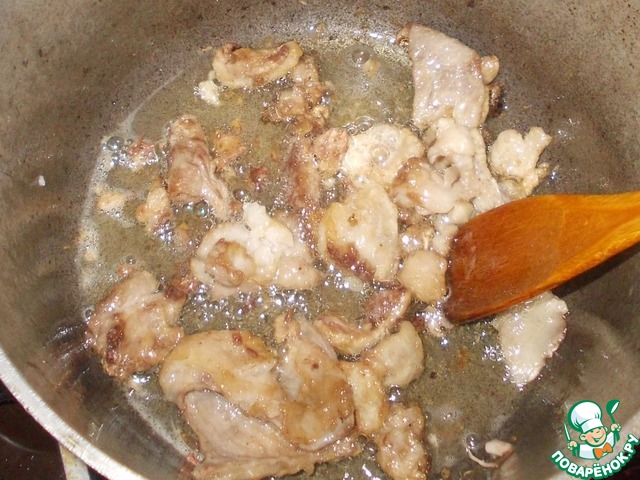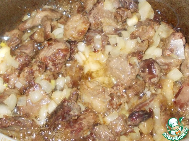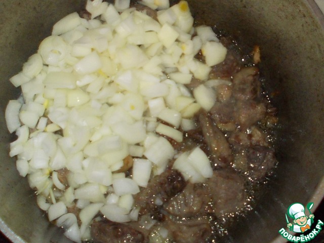 Обжариваем мясо до румянца и отправляем в казан лук.