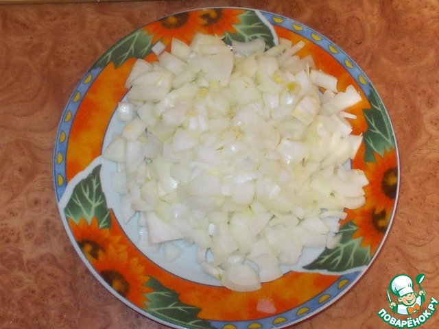 Перемешиваем и поджариваем до прозрачности и легкой золотинки.