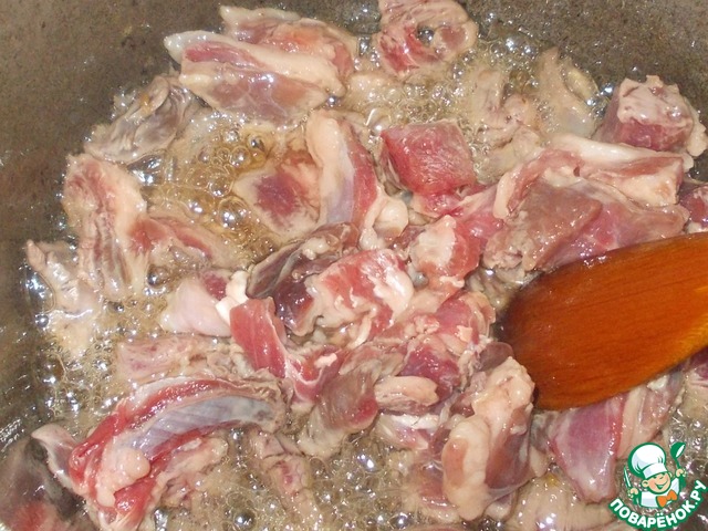 Из казана извлекаем выжарки. Увеличиваем огонь и отправляем в казан баранину.