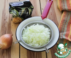Пока варится горох, очистить лук, мелко нарезать и залить кипятком на 20 секунд. Затем лук процедить, отжать от воды.