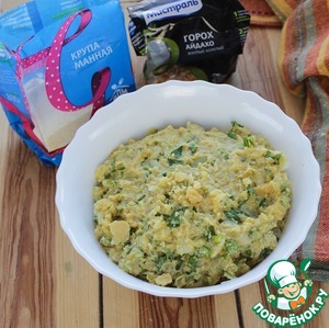 В чашке смешать лук, гороховое пюре, нарезанную зелень, всыпать манную крупу, посолить, поперчить.