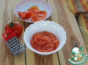 Пока жарятся котлеты, помидоры разрезать на 2 части и натереть на крупной терке, шкурку убрать. Соус посолить, добавить сахар, сушеный тимьян, томатную пасту, размешать, при необходимости можно добавить немного воды или овощного отвара с гороха.