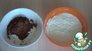 Муку делим так: для апельсинового теста нам нужно 90г муки, а для шоколадного - 50г муки + 1 ст. л. какао (также сюда идет ванильный сахар и разрыхлитель)