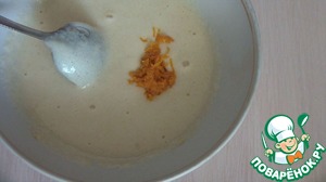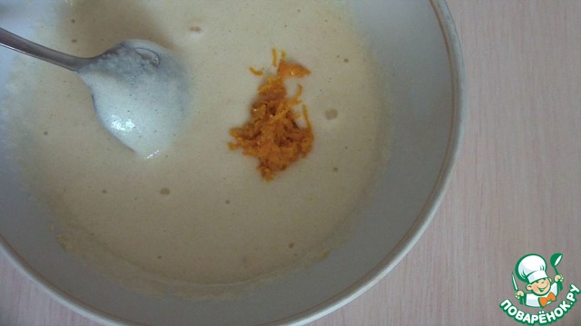 соду и апельсиновую цедру, тесто запенится! это реакция соды на кислоту. Затем постепенно добавляем муку. Тесто получается густое. -