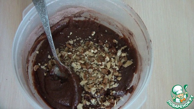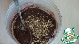 А во второе тесто добавляем муку с разрыхлителем и ванильным сахаром. Перемешиваем, добавляем рубленные грецкие орехи. Тесто также густое.