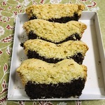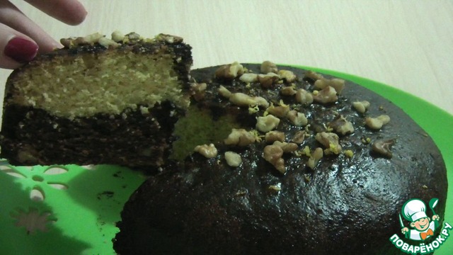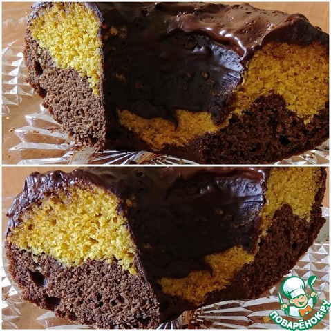Форму смазать растительным маслом и обсыпать мукой. Первым распределяем шоколадное тесто, затем апельсиновое.