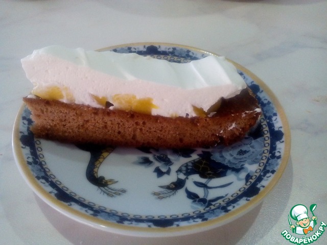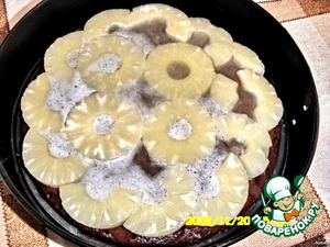 На остывший корж выложить ананасы, залить загуститель и оставить для загустения.