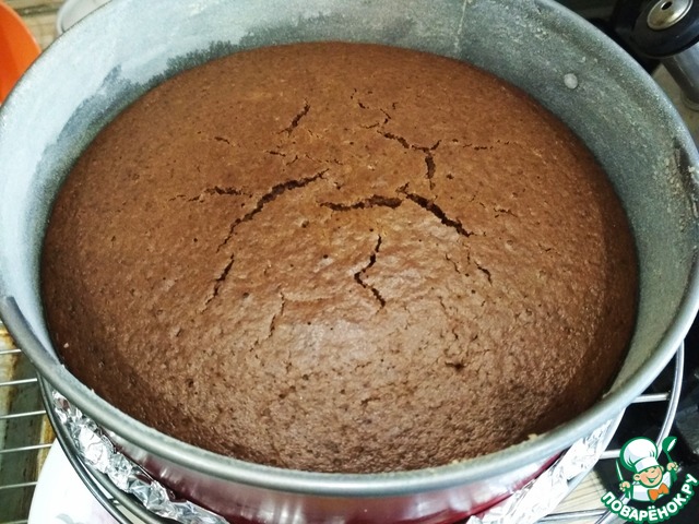 Готовый корж остудить в форме, затем аккуратно достать, завернуть остывший корж в пищевую пленку и убрать в холодильник на ночь. -