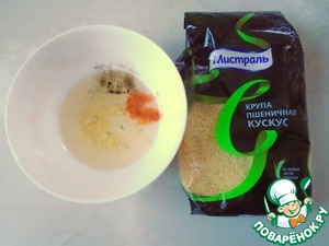 • Отмерить кускус ТМ Мистраль, залить кипятком, накрыть и оставить на пять минут, затем взрыхлить вилкой, дать остыть.