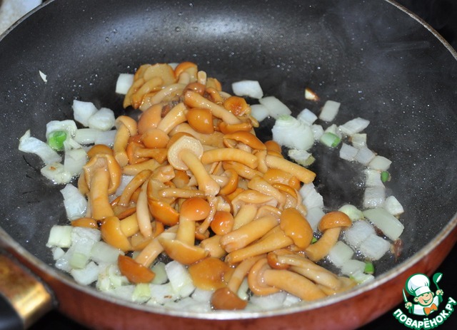 Кладём грибы. Можете брать любые по наличию и вкусу: свежие, вареные, замороженные. У меня вареные древесные опята. Они мелкие, резать нет необходимости.