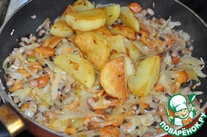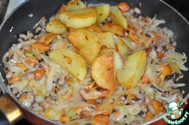 Добавляем жареный картофель, аккуратно перемешиваем, чтобы картофель не развалился.
