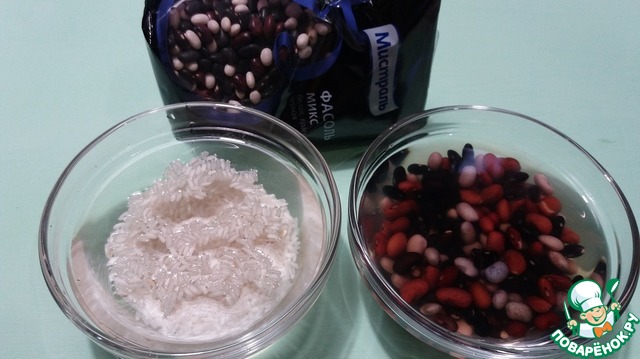 Перед тем как приступить к приготовлению супа, промоем и замочим в воде рис и фасоль на 4 часа.
