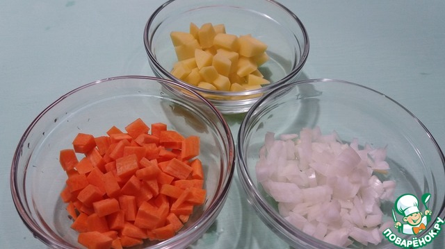 Подготовим овощи, картофель, морковь и лук моем, очищаем и нарезаем средним кубиком.