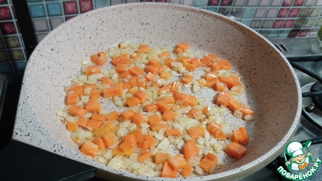 Делаем поджарку, на разогретую сковороду наливаем масло растительное и обжариваем лук до золотого цвета, и выкладываем обжариваться морковь, обжариваем еще 5 минут.