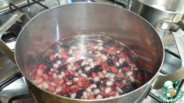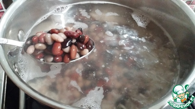 Прошло 4 часа, с фасоли сливаем воду, промываем и варим до готовности 50 - 60 минут.
