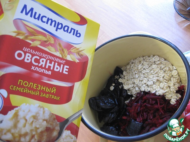 Свеклу помыть и натереть на терке, чернослив ополоснуть, - все сложить в кастрюлю, добавить хлопья