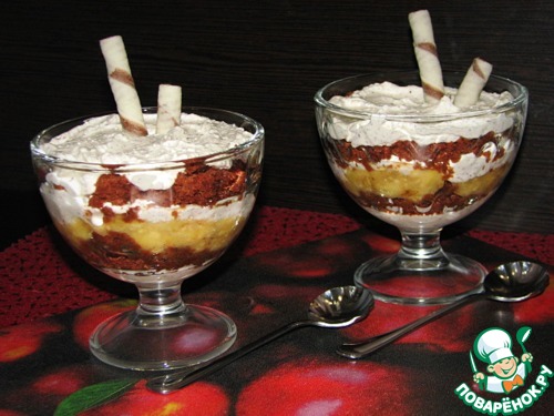 Бисквит для десерта нужен шоколадный, несухой. У меня был кусочек Шоколадного торта на раз-два-три по рецепту Андрея Рудькова.