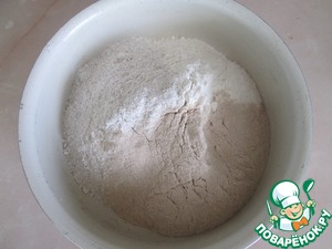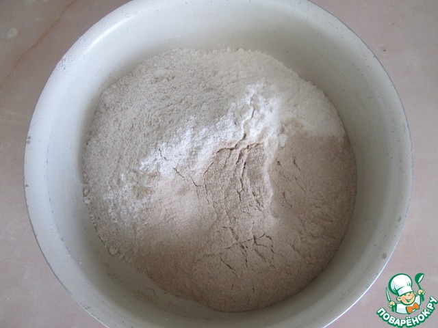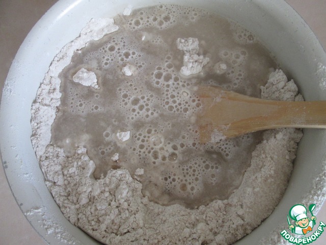 1. Поставить опару из 100 мл теплой воды, 100 г пшеничной муки и дрожжей. Оставить на 2 часа в теплом месте, а потом добавлять остальные ингредиенты и замешивать тесто.