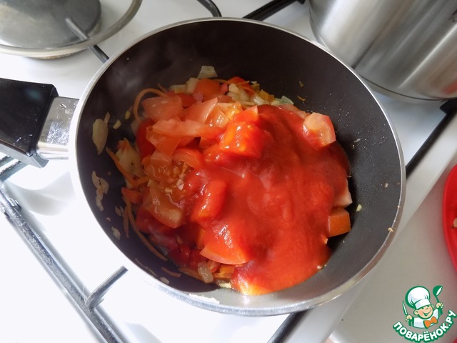 Отправляем в сотейник и добавляем протёртые томаты или просто томатную пасту. Перемешиваем, накрываем крышкой и готовим до готовности овощей. Это минут 12-15.