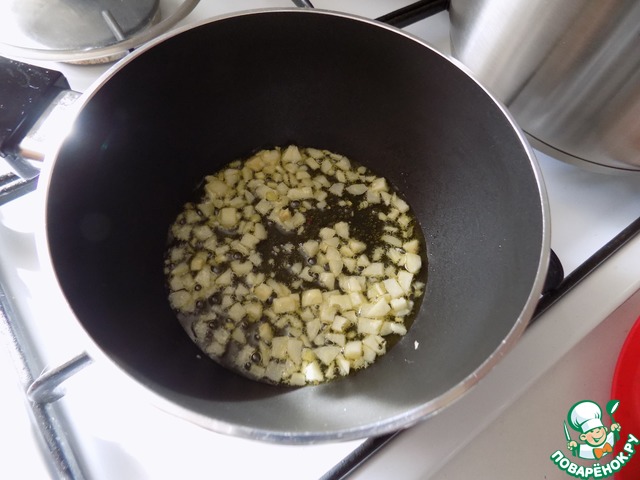 В сотейник наливаем масло, греем его и выкладываем мелко резанный чеснок. Обжариваем его с минуту.