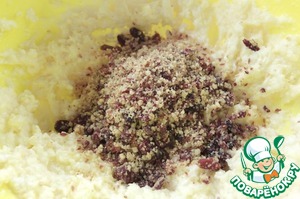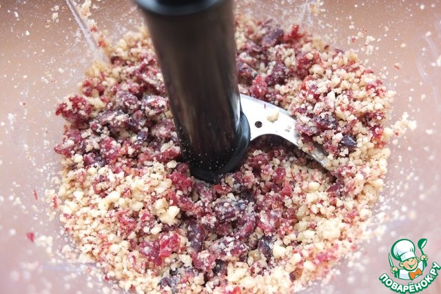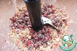 Добавляем измельченные орехи и клюкву, перемешиваем.