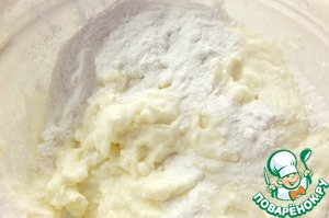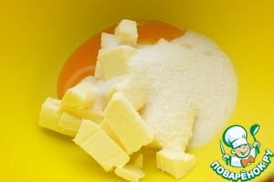 Размягченное сливочное масло, сахар, ванильный сахар и желток перемешиваем. Я взбивала миксером на небольшой скорости.