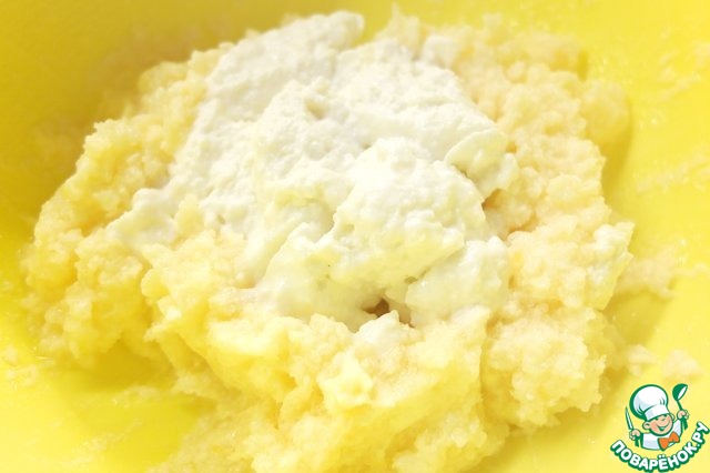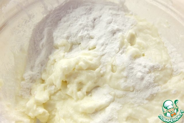 Добавляем сначала творог, потом крахмал, перемешиваем.