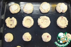Выкладываем на противень. В центре каждого шарика делаем углубление, я делала это толкушкой. В углубление кладем примерно 1 ч. л. начинки. У меня получилось 15 штук.