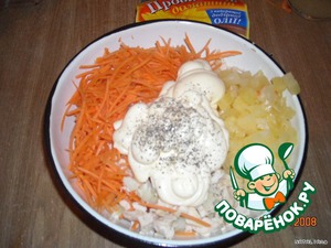 • Курицу,отварной картофель и ананасы порезать кубиками.Морковь натереть на крупной терке