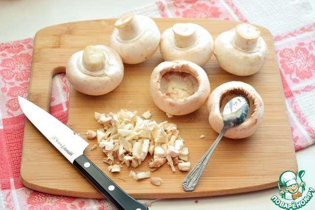 Свежие шампиньоны протрите чистой сухой тряпочкой, аккуратно вырежьте ножку и кофейной ложечкой аккуратно выскребите часть мякоти изнутри шляпки.