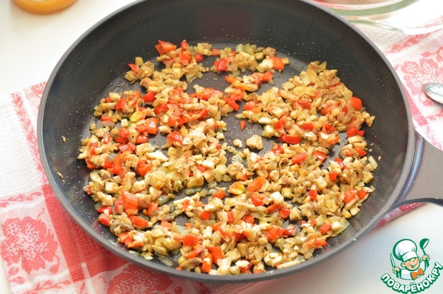 На сковороде в масле слегка поджарьте лук, мякоть грибов и болгарский перец. Снимите с огня, добавьте щепотку растёртой приправы для плова и немного соли