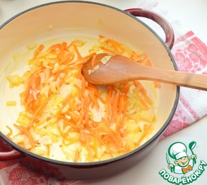 В глубоком сотейнике раскалите масло, поджарьте лук и морковь, в конце добавьте чеснок