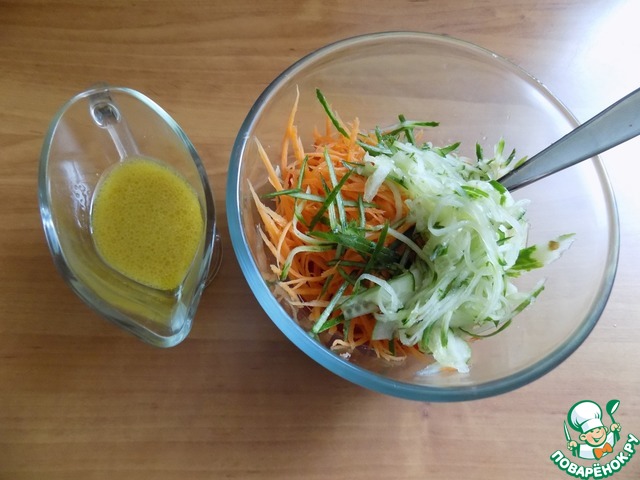 Морковь и огурец натираем на корейской тёрке. Если таковой нет, то огурец режем тонкими полосками, а морковь натираем на средней тёрке. Чеснок давим или очень мелко рубим. Выкладываем в салатник.