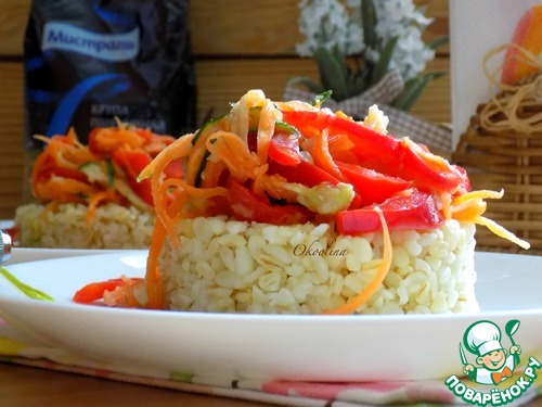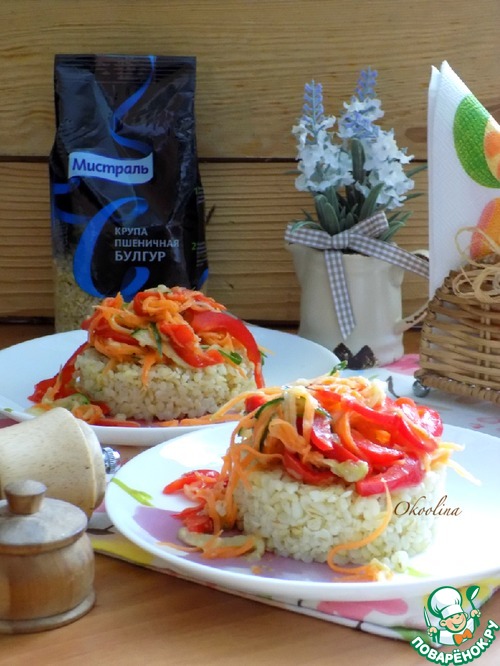 Овощной салат с морковью, огурцом и болгарским перцем на подушке из булгура. Пикантно, просто замечательно!