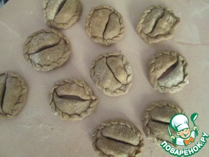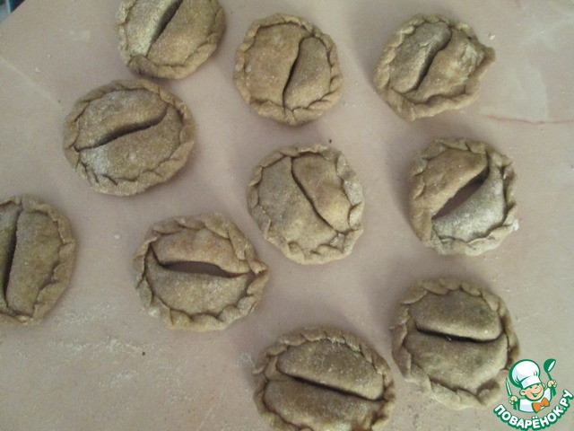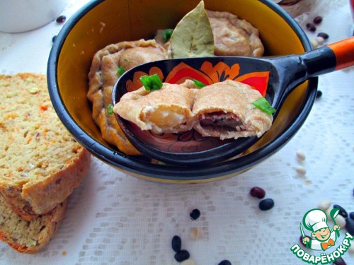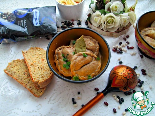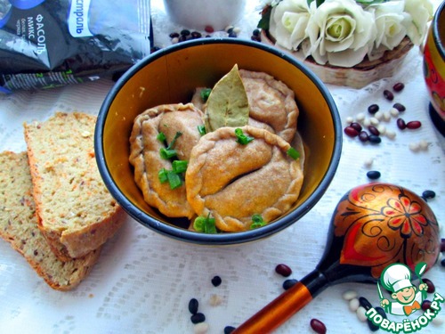 Сложить два вареника - один с фасолью, второй с картофельной начинкой друг к другу большой стороной вареника. Скрепить по концам. По желанию края вареников можно оформить косичкой. -