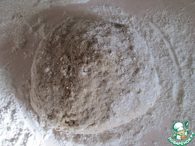 Соединить просеянную пшеничную муку с ржаной, добавить соль. Сделать в центре лунку. В неё медленно вливать чуть остуженную кипяченную воду (60С) воду и начать замешивать теста. Тесто будет горячим, поэтому нужно быть очень аккуратным! Вымешать тесто, накрыть полотенцем и оставить отдыхать на 25-30 минут. -