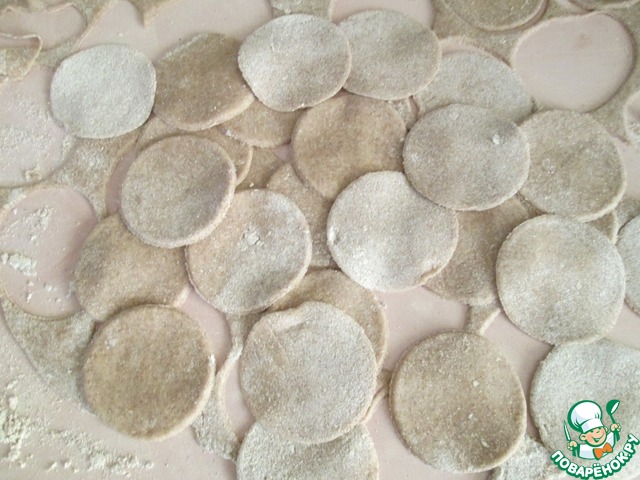 Отдохнувшее тесто раскатать в тонкий пласт. и вырезать тонким стаканом кружочки для вареников.