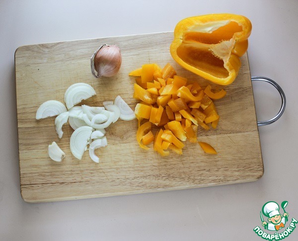 Нарезать лук полукольцами, перец болгарский соломкой.