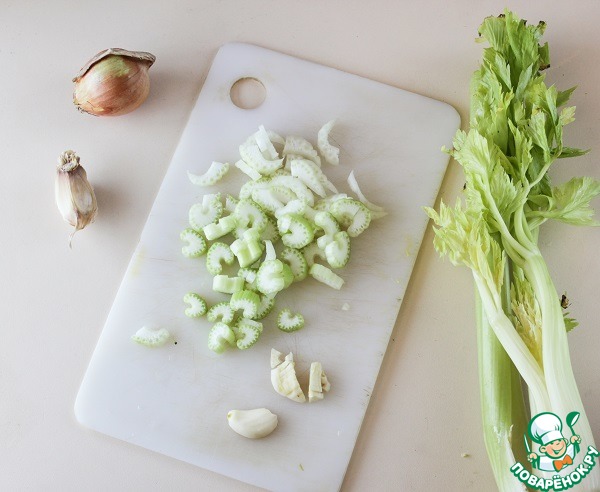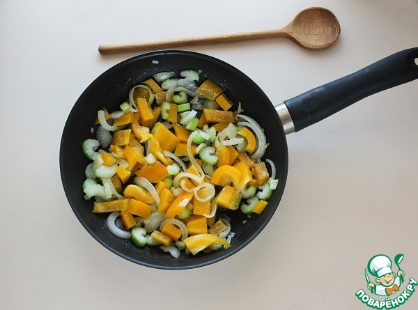 На сковороде с разогретым растительным маслом слегка обжарить измельченный чеснок, добавить нарезанные овощи и потушить до полуготовности.