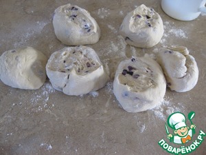 Рабочую поверхность стола чуть подпылить мукой, разделить тесто на 6 кусочков