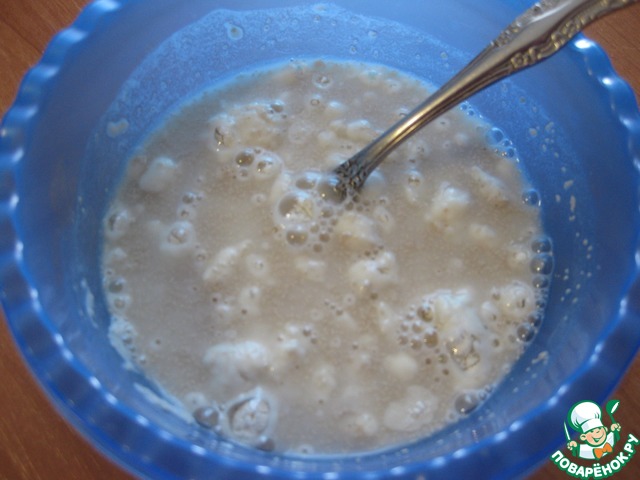 Пока варится чечевица, замешаем опару из дрожжей, сахара, 2 ст. л муки и 100 мл теплой воды