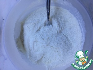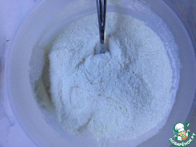 Смешиваем все ингредиенты, перемешиваем быстро (!!!), чтобы сахар разошёлся в духовке, а не сейчас.