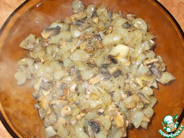Нарезаем грибы и лук не сильно крупно. Обжариваем на сковороде с растительным маслом. Солим буквально одной щепоткой и присыпаем хмели-сунели. Процесс жарки грибов я фотографировать не стала... Сразу результат сфоткала. И включаем духовку на 200 градусов, чтоб была разогрета к тому моменту, когда мы поставим запекаться мясо!