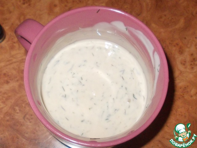 Пока грибы жарятся смешать ряженку, укроп и горчицу в пиалке или чашке.