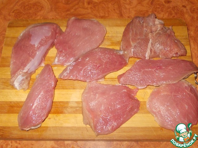 Грибы у нас все еще жарятся, а мы нарезаем мясо на куски. Толщиной примерно 1,5 см.